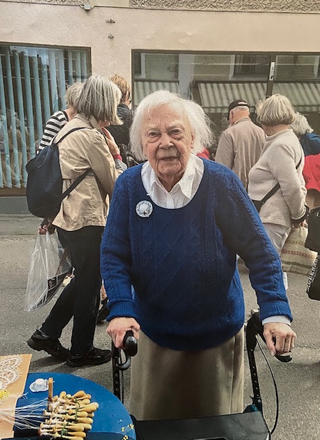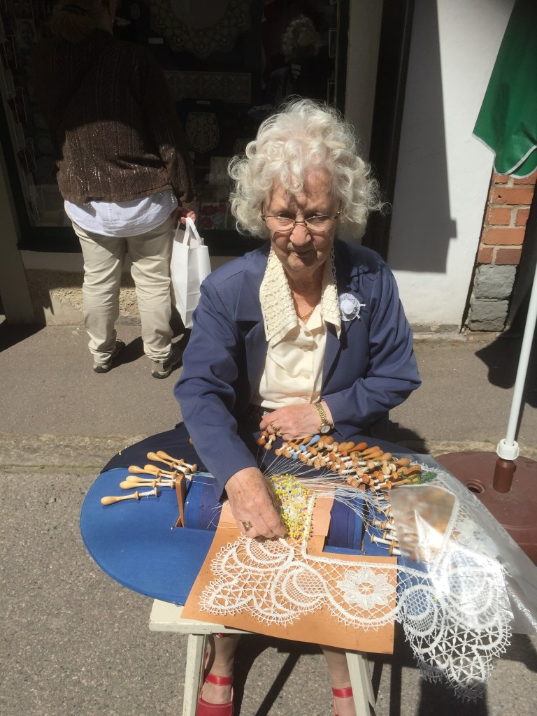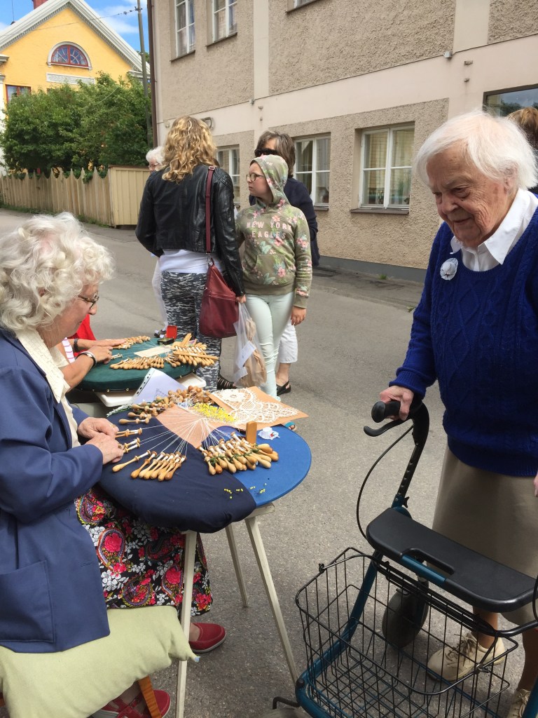 26 juni 2015: Detta blev den sista knyppeldagen mamma Gunnel var med på. Dagen till ära hade både mamma och Harriet Andersson varsin liten knypplad hatt på sig! Ni kan tro att alla ville köpa mönster på den Hatten! Nu kom det sig att det dröjde 5 år tills detta mönster finns att köpa – det vill säga just nu i år.
