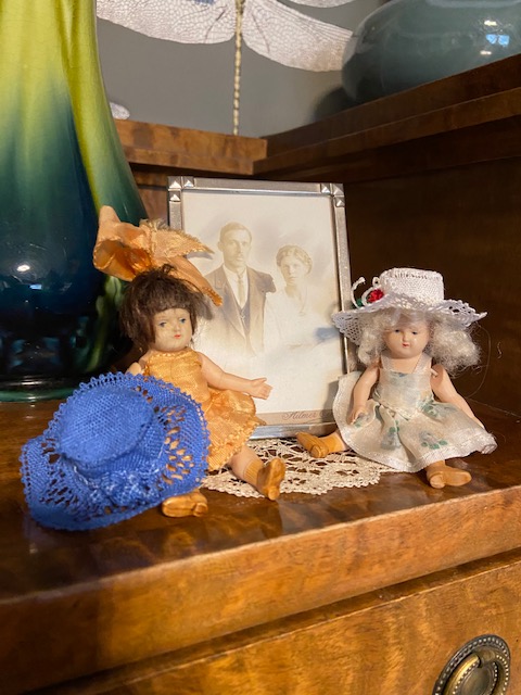 Här kan du se tre olika hattar. Den gröna är knypplad i Barkonie30 med band av Venne Multicolor. Den blå och den vita är knypplad i Bockens 60/2. På fotot med dockorna ser ni morfar Gunnar och mormor Elsa – deras förlovningskort från 1916.