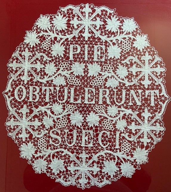 Kortfattat var det så att vi hade kommit altarspetsen på spåren. Tidningsurklipp + kontakt med en av spetsförläggaren Aurore Ingelotz´s släktingar + det mönster vi själva hade i affären + information av vad mamma kom ihåg att mormor berättat om mönstren pusslades ihop. De två medaljongerna som ni ser nedan beskrevs i en tidningsartikel från 1895. Det stod att dessa ingick i en altarduk som beställts från Ingelotz av personer i Stockholm och som skulle levereras till Birgittas hus i Rom. Vi var rätt nöjda så långt -vad mer kan man väl få fram? Vi kunde knyta ihop mönstren med Ingelotz! Men så den 7 oktober 2013 kom bildbeviset från nunnorna i Birgittas hus i Rom. Duken fanns – och den togs fram varje år till firandet just den 7 oktober. Detta blev ett speciellt år. Först fyllde mamma 90 år den 6/10 sedan kom bilderna på duken den 7/10. I skyltfönstret hade vi en liten utställning om det hela. (det som ni nu kan läsa på länkarna ovan)