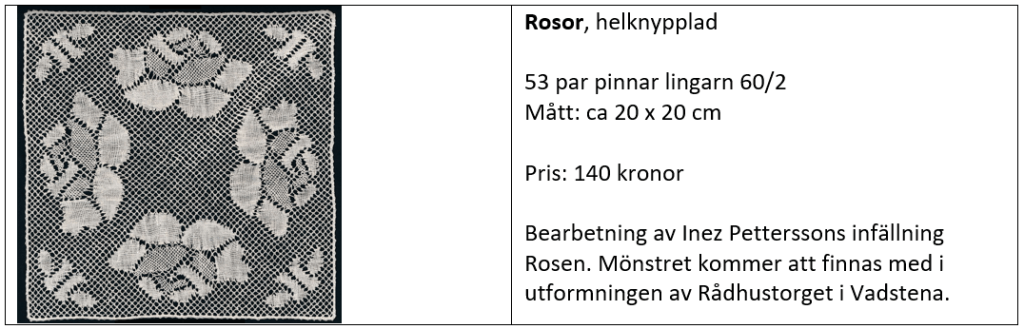 Och så kommer det lite mer ROSETT-inspiration! Kassen och den rosa + blå har Kerstin Olsson knypplat och diademet har Maritha Gustafsson knypplat. Vadstena levererar. Tack för att jag får använda era bilder. Mönstret kostar 30 kronor.
