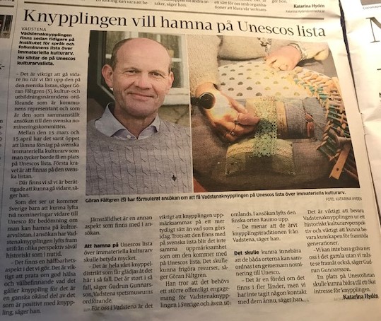 Att Vadstenaknypplingen redan är ett immateriellt kulturarv vet ni säkert redan. Nu har en ansökan för att försöka få in Vadstenaknyppling på Unescos världsarvslista skickats in. Initiativet till detta kommer från Göran Fältgren. Gudrun Gunnarsson från Vadstena spetsmuseum och jag har också varit med och skrivit ansökan. Nu gäller det bara att hålla tummarna! Tack till Göran för att du initierade detta och drev på för att få detta till stånd!