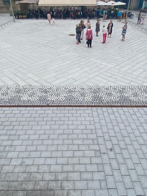 Som jag skrivit om tidigare har Rådhustorget i Vadstena genomgått en ansiktslyftning. Jag visade då det ursprungliga förslaget där Inez ros framträdde i plattläggning och på sittmöbler. Se nedanstående bild. I bildspelet under denna bild ser du olika varianter på Inez ros; Rosen, längdmönstret, hörnet samt den helknypplade.