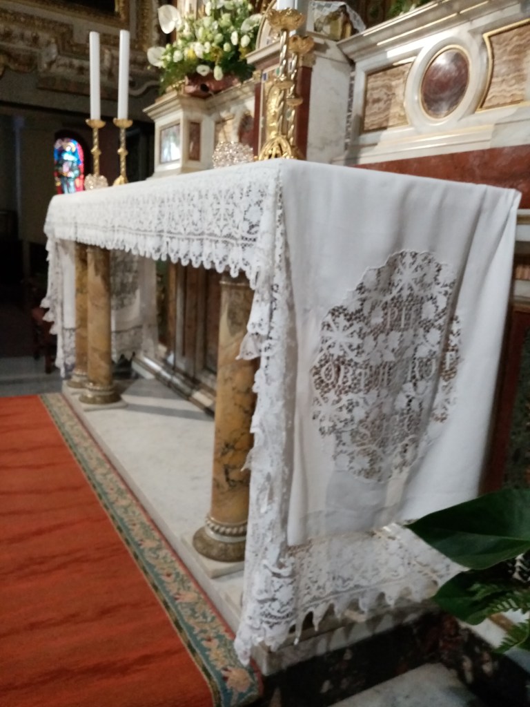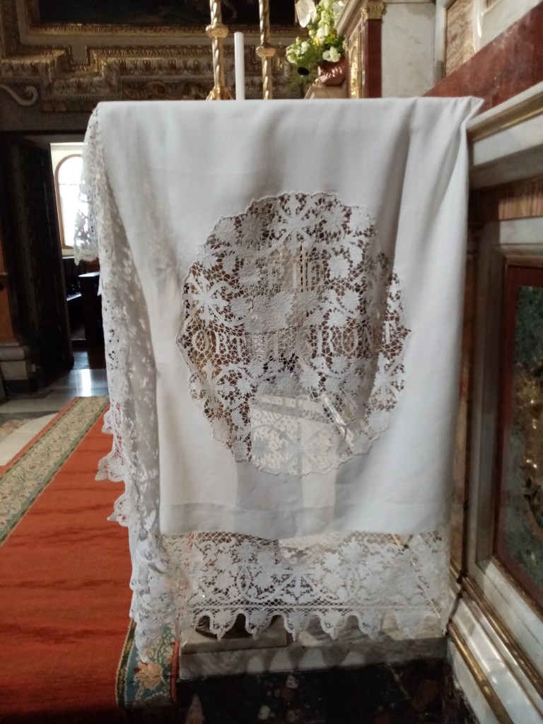 Den 23 juli närmar sig – heliga Birgittas himmelska födelsdag. I Rom förbereder man sig för att fira detta och spetsduken från Vadstena är på plats. Jag har varit i kontkat med nunnorna i Rom ännu en gång och har idag fått foton på duken. Allt är klart. Nu väntar de bara på imorgon! Vill du läsa mer om denna fantastiska altarduk så finns texten på https://elsapetersonsspetsaffar.com/6e-och-7e-oktober/ och på https://elsapetersonsspetsaffar.com/altarduken/ Samt självklart måste man i detta sammanhang även läsa om Aurore Ingelotz på https://elsapetersonsspetsaffar.com/aurore-ingelotz/