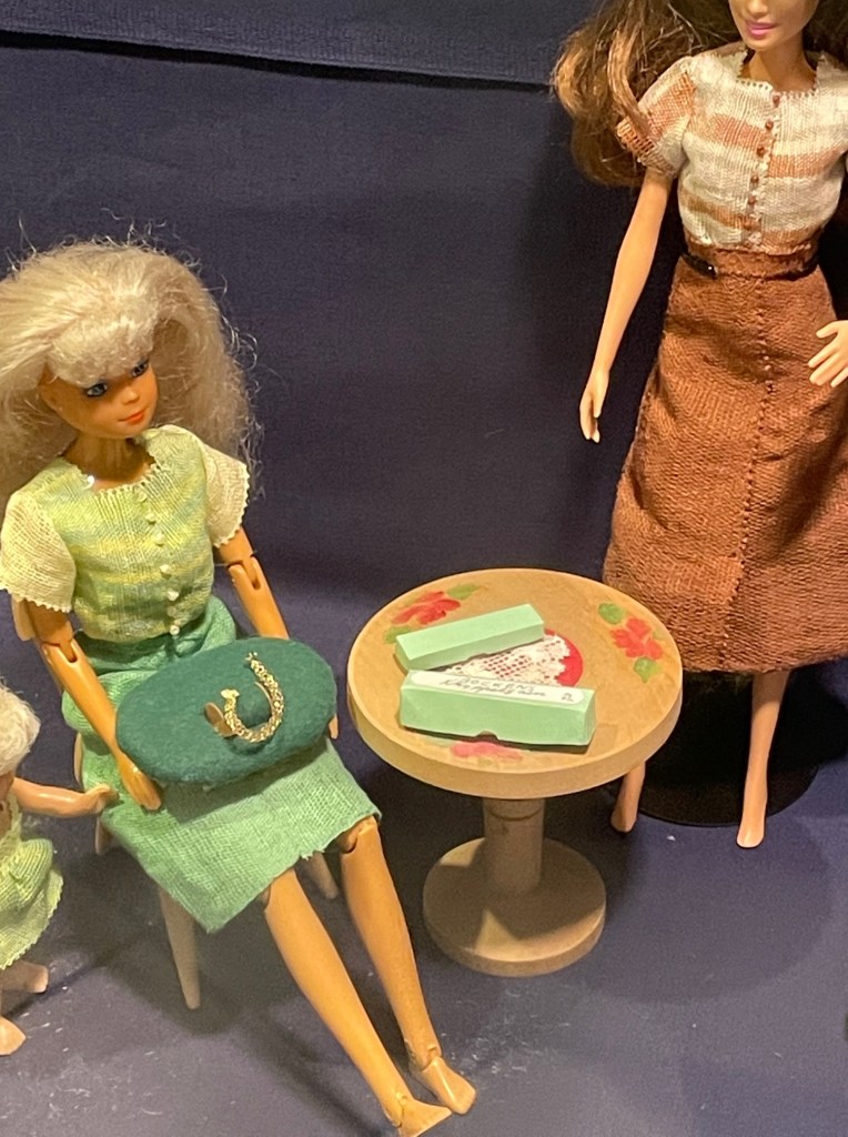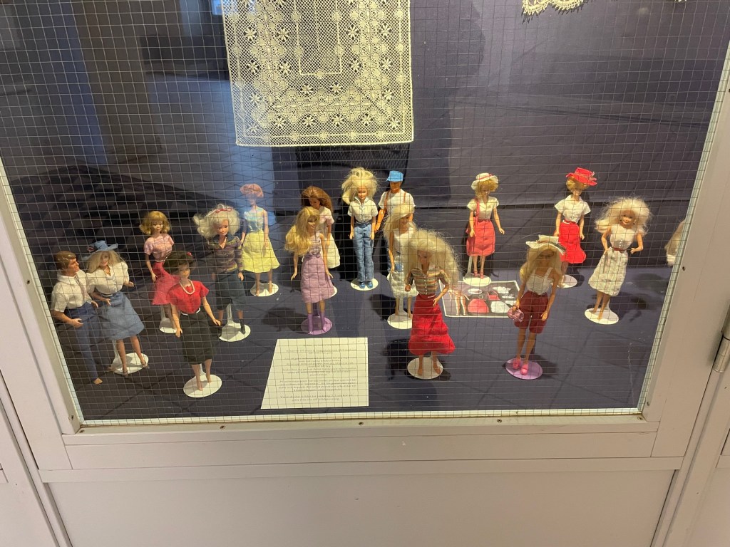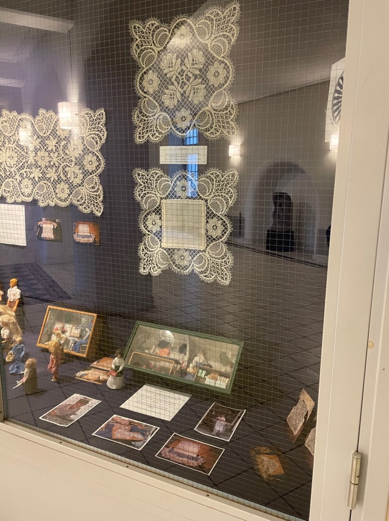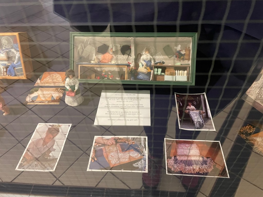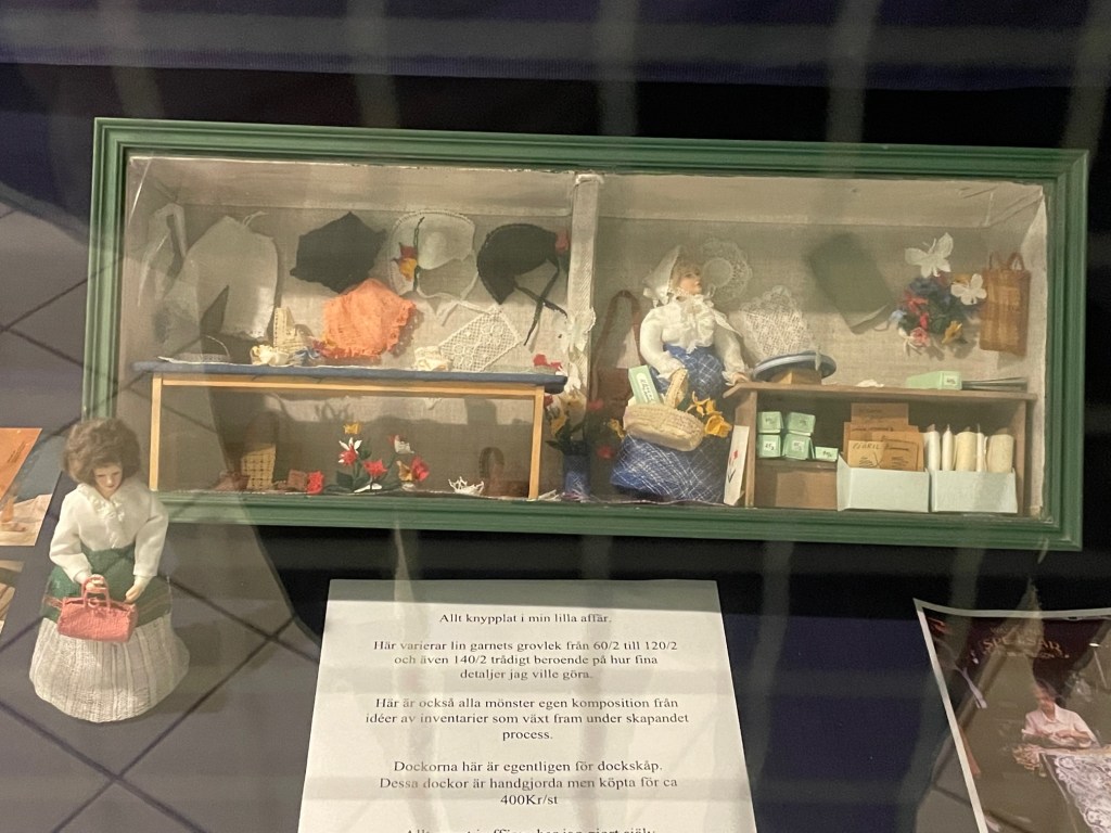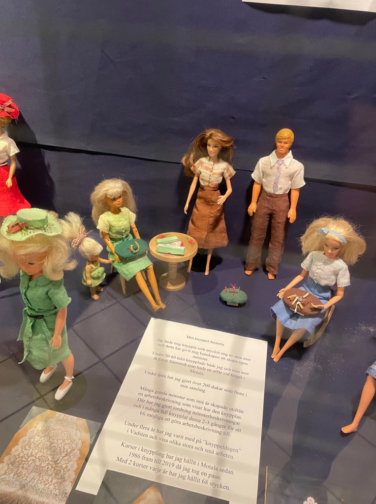 Har du vägarna förbi biblioteket i Vadstena? Gå då in och titta på Harriet Anderssons utställning! Jag tog lite bilder i lördags till er som inte har möjlighet att åka dit. Hon är som ni redan vet väldigt skicklig, båda att knyppla men även att sy kläder. Kläderna till dockorna är tillverkade enligt konstens alla regler, som om de skulle sys till en människa. Skillnaden nu är att allt, inklusive underkläder, är knypplade. I utställningen finns även hennes minibutiker. T.o.m. små minikartonger för garn och annat kan ni se där. Det är också några imponerande dukar uppsatta på väggen. Mönstrena till dessa kommer från Elsa Petersons Spetsaffär, och Harriet har vid olika år knypplat på dessa utanför butiken på Storgatan 23. Det är ett tunt metallgaller i fönsterrutorna, vilket gör att en del bilder kan vara lite otydliga. Jag hann även med ett besök vid graven. Mamma fyllde 99 år i torsdags den 6/10 och så var det namnsdag i fredags 7/10 (Birgitta), så vi hade lite att fira.