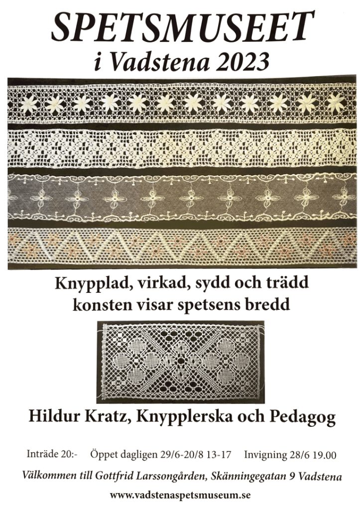 Jag ser fram mot att träffa er alla på Skänningegatan 9, Gottfrid Larssongatan – där Vadstena spetsmuseum ligger. Jag har öppet: Torsdagen den 28/6 kl. 13-17; Fredagen den 29/6 (STORA KNYPPELDAGEN) kl. 10-17; Lördagen den 1/7 kl. 11-17; Söndagen den 2/7 kl. 10-13. Mönstret ovan är komponerat av Karin Granbom Johansson. Hon döpte mönstret till Med hjärtat i centrum! Precis som hon alltid var själv!