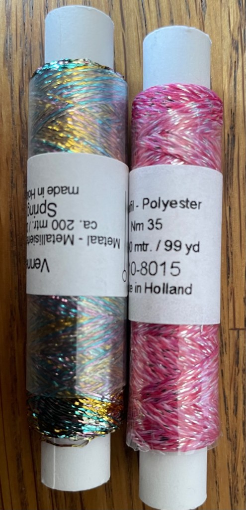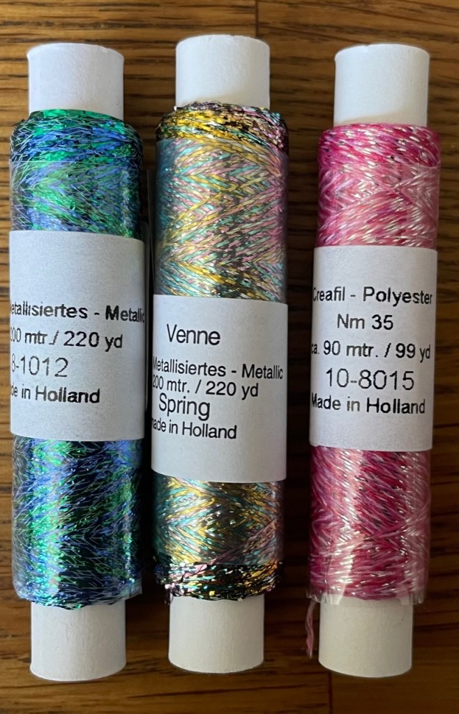 3 stycken spolar melerat metallgarn enligt bild ovan. Tunn tråd som t.ex. kan används som följetråd. Ordinarie pris 3×35 kronor = 105 kronor NU 45 kronor [Av denna uppsättning har jag 3 x 3 rullar i dessa färger] SÅLT