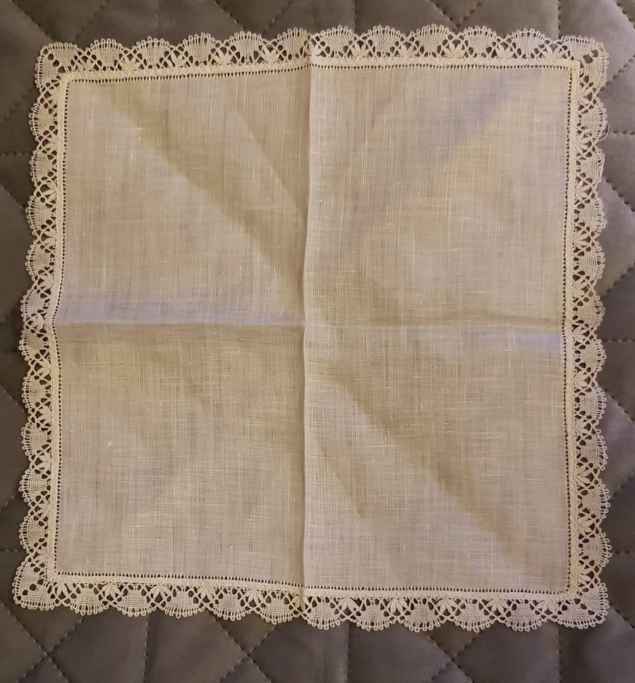 Genom en fråga i ett mail från Kristina kom jag in i dessa tankar igen. Hon skickade bilden av en näsduk och undrade om jag kände igen den. Hon har även lagt ut den i gruppen Knyppling på FB, där flera verkar känna igen den – men mitt antagande är att man vid en snabb anblick har trott att det är Sockerudd och spindel. Mitt råd är då att titta närmare. Ni som kan knyppla – ni vet att det inte är lätt att knyppla mandlar – och om vi tittar på denna näsduk ser vi inte mindre än 176 små mandlar. En betydlig skillnad mot att knyppla lite spindlar – eller hur? Jag tror att ni som tror att det är denna ni har knypplat skulle ha kommit ihåg om ni hade knypplat så många mandlar.