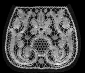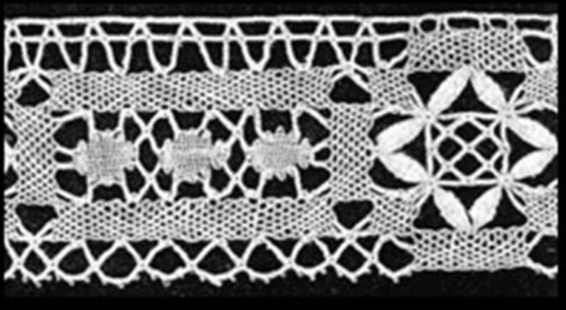 För att ge ett sista exempel som handlar om historiens gång och att historien upprepar sig vänder jag mig till Elisabeth Thorman i Äkta spetsar. Hon skriver bland annat om spetsarnas förfall då Torchonspetsar började knypplas i allt högre grad i Vadstena. Då tänker jag – vad är det för fel på dessa? De är ju vanliga även idag och den som knypplar dessa är säkert jättenöjd med det. Hon skriver också att mönster som tar intryck från naturalism är stillösa. Boken är skriven 1913 och Jugend som konststil hade funnits ett tag. Uppenbarligen var hon inte förtjust i denna och fördömde därmed även spetsar inom denna stil. En som däremot gillade Jugend var min morfars kusin Inez Pettersson som var mönsterriterska i Vadstena. Det kan man se i många av de mönster som hon komponerade. Ett exempel ser du i nästa bild. (och att Jugend åter är populärt kan vi ju se i alla olika auktionsprogram som går på TV)