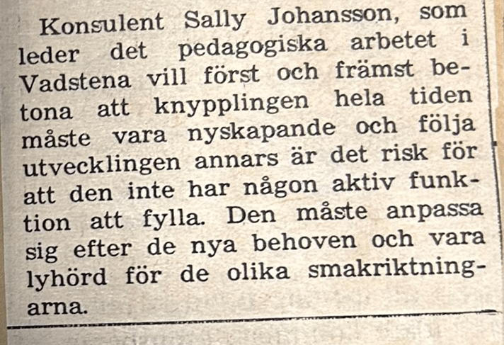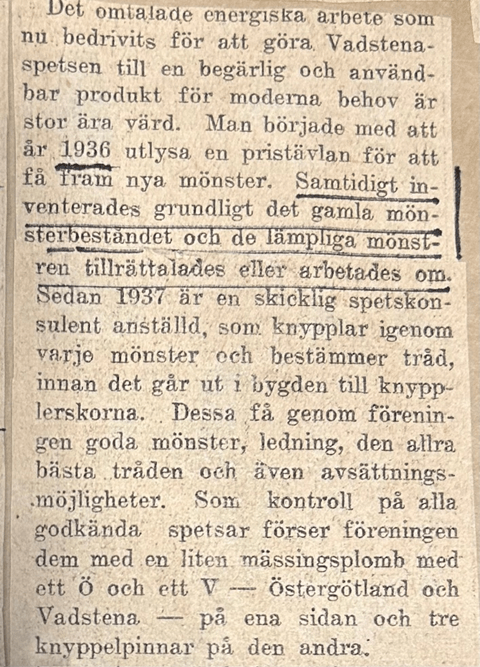 Varför är det då ont om mandlar i modernare spetsar? Ett svar är att många upplever dem som svåra att knyppla. Tänk då så här – om du häller ut alla mandlar ur en påse och tittar på dem så är alla inte lika! Om naturen kan variera utseendet på en mandel så kan du! Om vi backar bandet så var inställningen till en spets utseende annorlunda inom den traditionella Vadstenaknypplingen än den inställning som smög sig på från 1930-talet och framåt. Tidigare var det en självklarhet att 2 olika personer knypplade på sitt sätt – även om de följde mönstret hade de lite olika sätt att ta sig fram. Man får även tänka på att man inte hade några beskrivningar. Något annat att tänka på var att tillgång på garn var på ett annat sätt. Vad hände då? Jo ibland kunde en spets se lite mer kompakt ut om garnet var lite tjockare och ibland kunde den tvärtom se lite gles ut. Klart att man hade en bild av vad som vore det vackraste, men samhället var annorlunda t.ex. vad det gällde tillgång av material. I ett försök att ”räta upp” och välja ut lämpliga mönster genomfördes 1936 en tävling. Denna tävling innebar att en mängd mönster kunde ha försvunnit från arenan. Som framgår av urklippet nedan medförde denna tävling en potentiell stor utrensning på mönster.