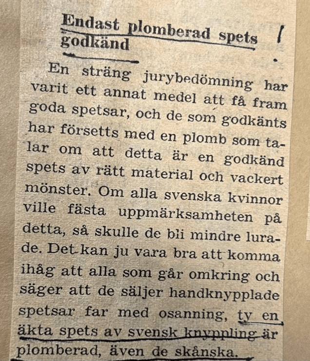 Ett sätt att styra upp ytterligare var att plombera spetsen (se urklippet ovan och nedan). Tänk er själva – på den tiden fanns det flera spetsförläggare med rötterna i spetsförläggartraditionen i Vadstena som saluförde bra många fler mönster än dessa utvalda spetsar. Plombens betydelse salufördes stenhårt vilket ledde till att spetsförläggare som min mormor Elsa, Frk Randel och Klara Larsson fick fullt sjå att övertyga sina kunder att de spetsar de sålde var äkta. Det ledde på sikt till att var och en skaffade egna äkthetsmärkningar. Den första plomben som mormor hade ser du i bilden ovan.