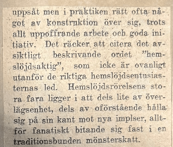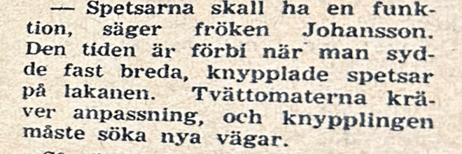 Apropå garn – det sker förändringar även nu för tiden. Om vi håller oss till Holma Hälsinglands garn (Bockens) så har nog flera av er uppmärksammat att garnkvaliteten är annorlunda i dag än förr. Det är flera detaljer i tillverkningsprocessen som är annorlunda – så även om det då var väldigt tillrättalagt med vilket garn som skulle vara perfekt i en viss spets enligt urklippet ovan så stämmer det inte idag. (och ”perfekt” enligt vem tänker jag)