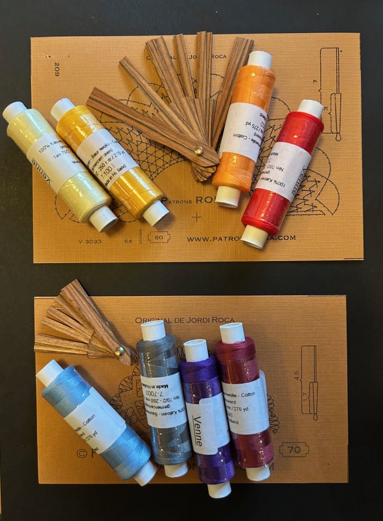 Till vissa av erbjudandena (de mindre solfjädrarna) ingår både mönster, ställning och en rulle Venne 70/2. Garnet finns i många olika fäger. I bilden visas några olika färger. Alla färger som finns hittar du på denna sida: https://elsapetersonsspetsaffar.com/garn-tillbehor-2/