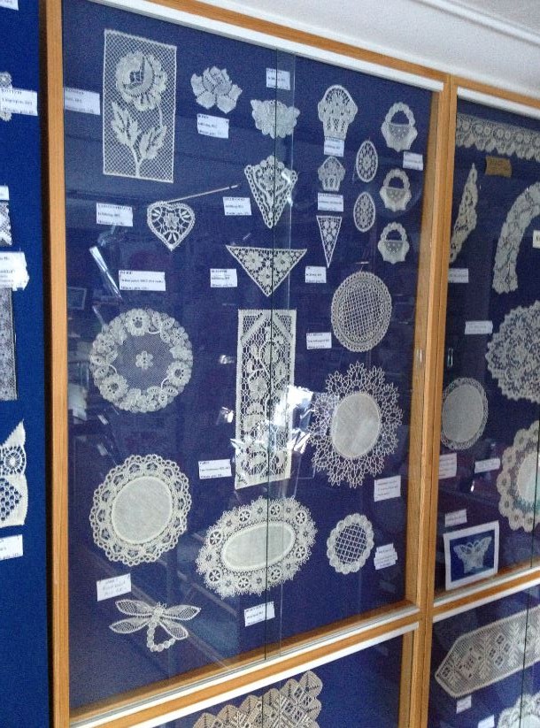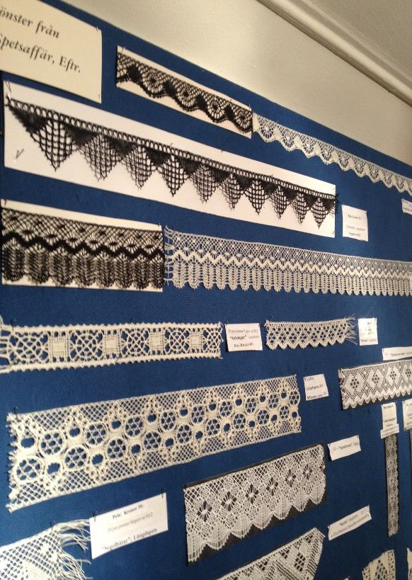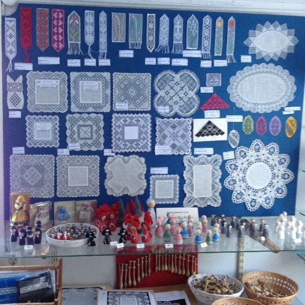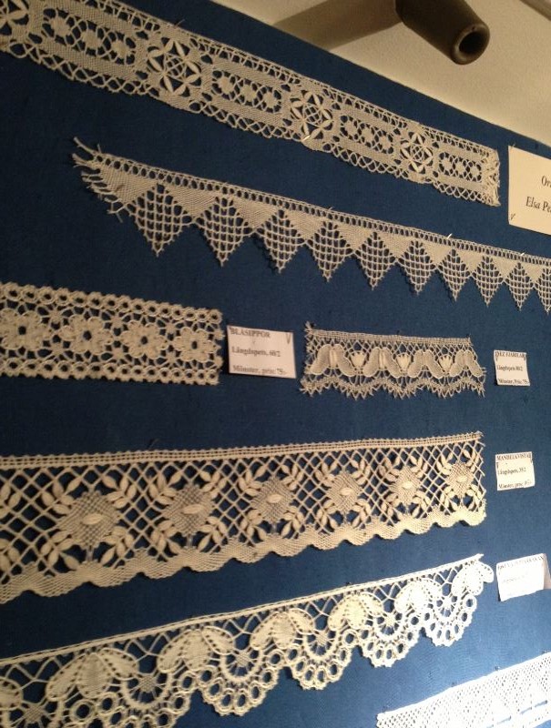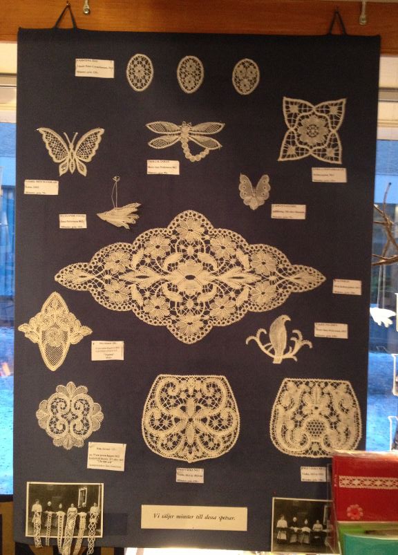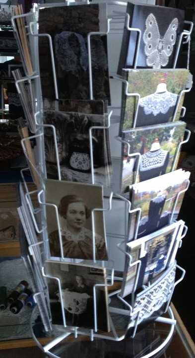 De två sista bilderna visar våra egna vykort. Vykorten på fru Krage har varit slutsålda men finns åter i lager. Det finns också helt nya vykort på spetsarna Mandelkvistar, Vadstenafjäril, Inez blomma, Liten blomkorg och infällningen Blåsippan. Dessutom kragen och väskan från Rom, Alma Karlsson knypplandes en altarspets samt en vacker dam med en pepparkakskrage. (alla kort kostar 10 kr/st)