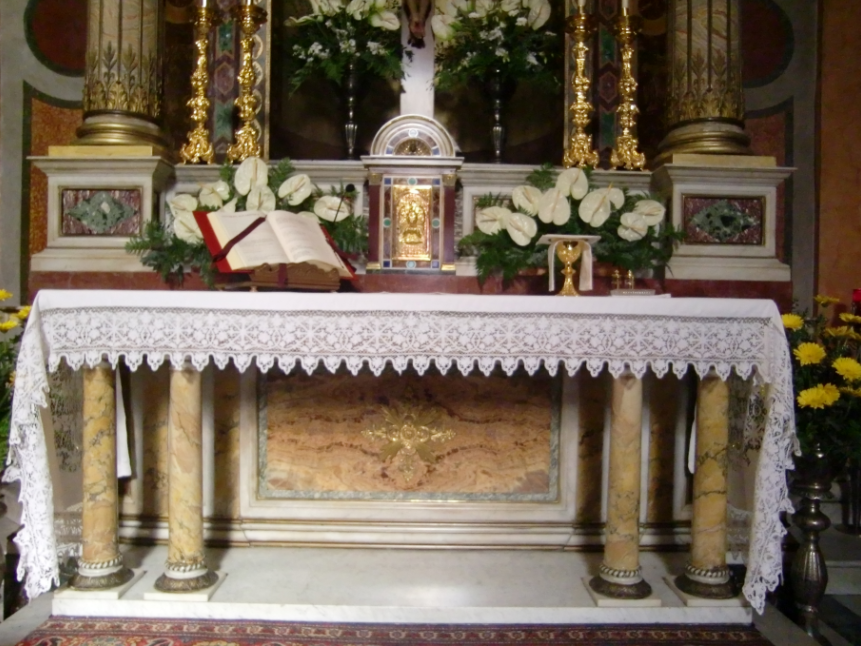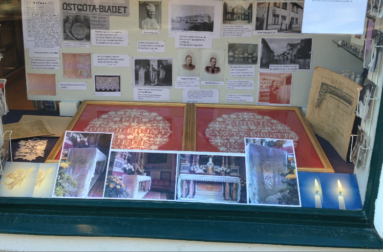 När vi fick bilderna från Rom placerades dessa längst fram i fönstret så att man kunde jämföra altarduken med tavlorna.