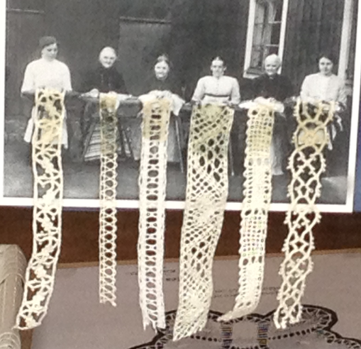 Här ser vi Hulda Andersson, 4:a från vänster, med Hjärtat och korgen och längst till höger Ruth Pettersson med en flätspets. Flätspetsar är gamla! I Sverige finns exempel på flätspets från 1600-talet i Kumla kyrka. I Schweiz finns det exempel på flätspets redan från 1500-talet. Man kan se likheter mellan flätspetsar och den knytteknik vikingarna hade i sina skärp.