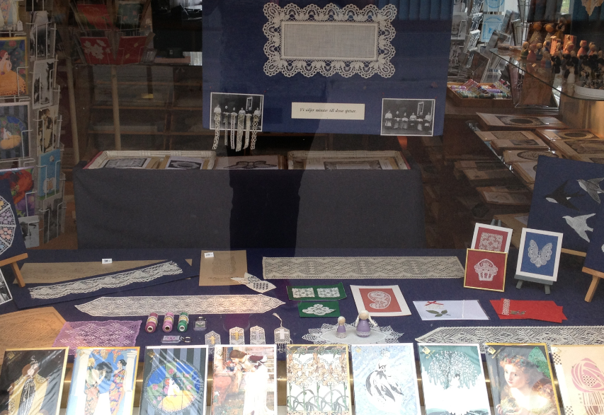 Nu är det omskyltat. På den blå tavlan ser ni de flitiga knypplerskorna till vänster. Vykortet finns att köpa för 10 kronor. Som ni ser har vi Stella i fönstret till vänster knypplad i lila och vitt. Många vackra dubbla kort i förgrunden.