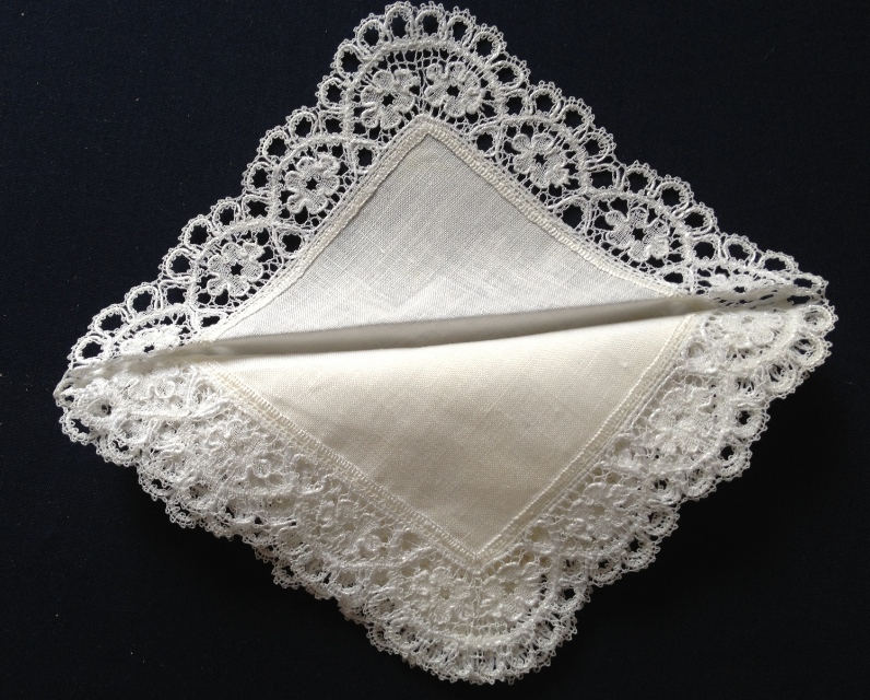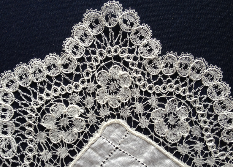 Blåsippan är väldigt populär som näsduksbård. Här ser vi hörnet på den bredare varianten av enkla Blåsippan.