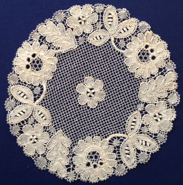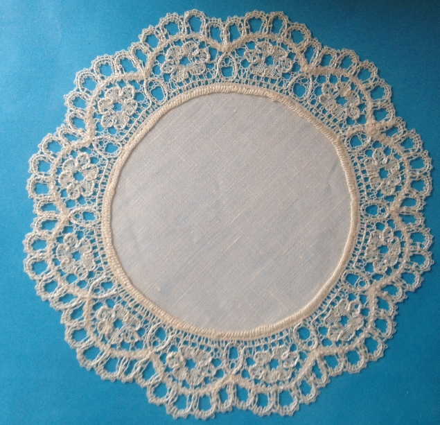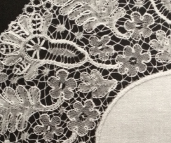 I den här runda helknypplade spetsen ser vi Sippor och Eklöv på samma sätt som i Klosterliljan. Att detta mönster inte går under namnet Klosterliljan är just avsaknaden av Klosterblomman. Vi kan också se en annan blomma och en annan lövformation. Dessa återfinns också i nedanstående spets.