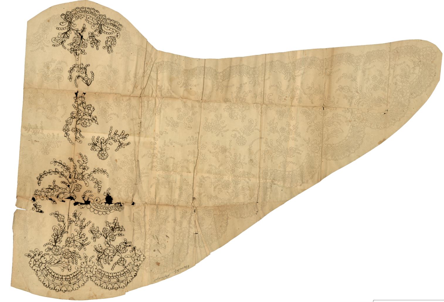 Hade inte detta utkast funnits hos Johannas släkt skulle vi inte vetat att den mönsterdel som återfanns i Emie Särnstedts samling kom från Johanna. Från början när jag kom till museet med ”mina” utkast var de två yttersta delarna av ”vingarna” uppsatta i utställningen om Särnstedt. Tack vare utkastet från Johanna kunde vi nu dels se att dessa båda delar hörde till en mantilj, vilket inte alls var känt innan, samt även att de kunde kopplas till just Johannas mantilj. Här hade historien lätt kunnat förvanskats och mönstret skulle ha kunnat tillskrivas fel person.