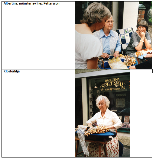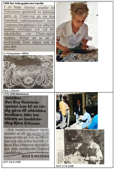 Harriet Andersson är en mycket skicklig knypplerska, och med sin yrkeskunskap har hon under många år varit Elsa Petersons Spetsaffär behjälplig med att ta fram mönster. Detta gäller både nyproduktion av gamla mönster men också egen-komponerade mönster. Många har säkert sett Harriet utanför affären på knyppeldagarna. I år knypplade hon Pepparkakan, festremsa, ett mönster som kommer att ges ut under hösten.
