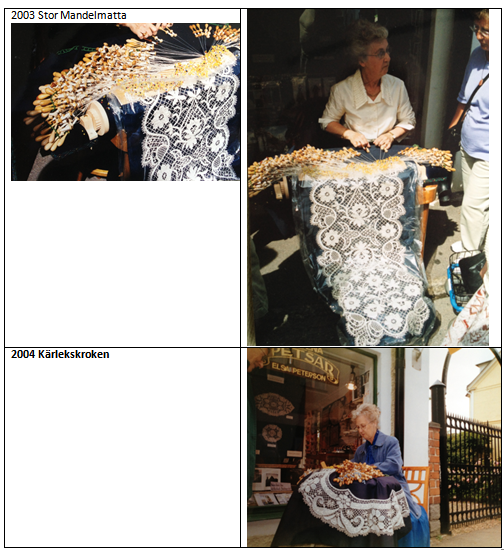Här följer en kavalkad av bilder på Harriet från olika knyppeldagar. Vi är lite osäkra på årtalen på några av bilderna och vi kanske har missat att ta kort något år. Men eftersom Harriet är ett kärt motiv att fotografera så kanske du har en bild som inte vi har, eller att du har koll på ett årtal som vi har tappat bort. Om det är så får du hemskt gärna höra av dig! (maila till elsapeterson.spetsar@gmail.com eller skriv ett meddelande under order & kontakt)