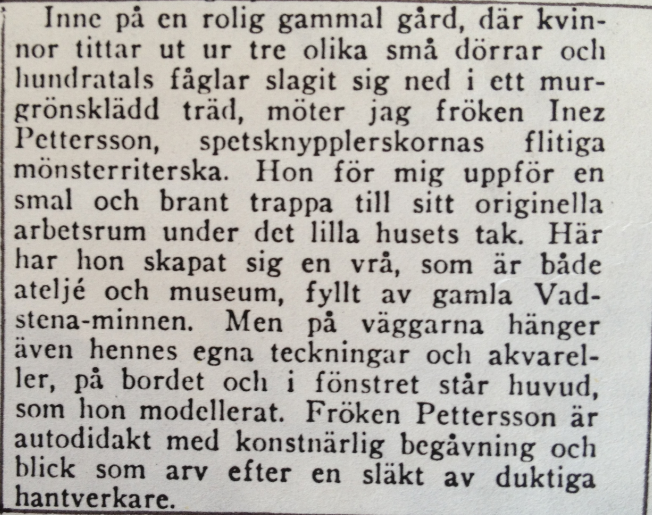 En av Vadstenas skickligaste mönsterriterskor heter Inez Pettersson. Inez var både mönsterriterska och mönsterstickerska. Hon gjorde även bearbetningar av befintliga mönster. Inez var kusin med Elsa Petersons man Gunnar och efter hennes död övergick hennes mönster till Elsa Petersons Spetsaffär. Under senare år har Gunnel Landtblom givit ut många av Inez mönster. En del av dessa mönster presenteras här i denna text, i övrigt finns mönstren att finna under sidan Butik här på hemsidan. Inez hade fullt upp med att förse knypplerskorna med mönster vilket framgår av ett reportage i Idun nr 14 1938.