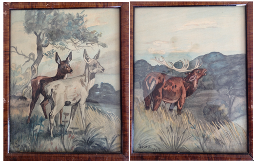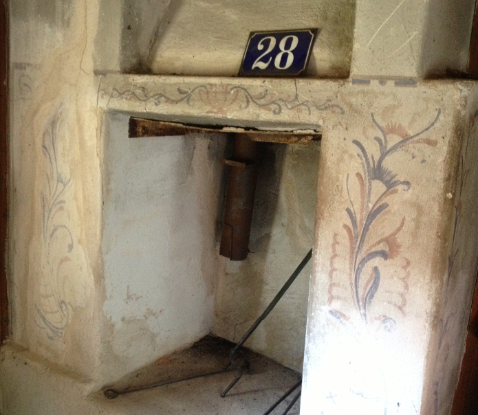 Här ser man några av Inez tavlor samt hur Inez dekorerat tapeten. Tyvärr är stugorna i mycket dåligt skick vilket kan ses i taket på denna bild.