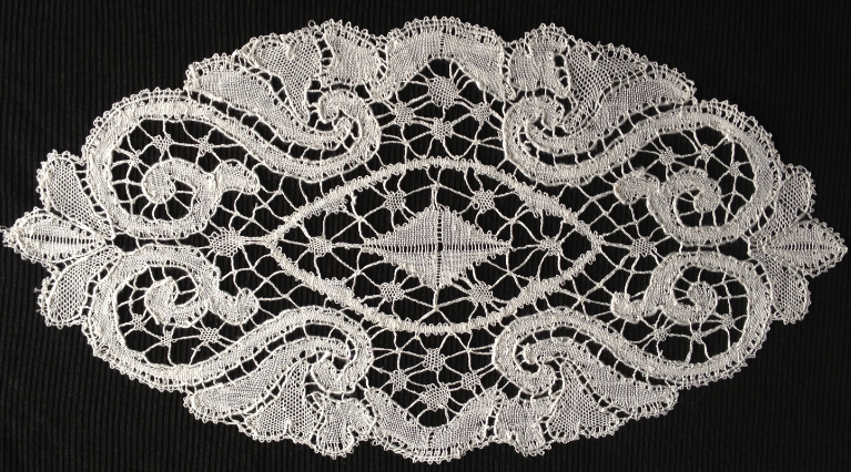 Många av Inez mönster är inspirerade av jugend. Denna helknypplade ovala duk är ett exempel på detta.
