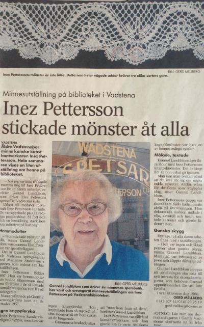 2004 arrangerade Elsa Petersons Spetsaffär Eftr. i samarbete med Vadstena Spetsgångare en minnesutställning över Inez Petterson i Vadstena bibliotek, Östgötacorrespondenten 28 maj 2004. Mönstret i överkant på artikeln, Vågade uddar, säljer vi under sommaren för 20 kr, se Rea.