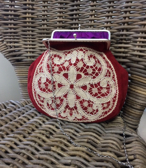 Här har vi en variant. Vi ser både Inez väska 2 till vänster och Inez väska 1 till höger, monterade på rött renskinn med mockasidan utåt. Insidan är fodrad med rödlila siden. Väskan är knypplad och monterad av Eva Wikström.