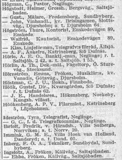 Helmer och Hanna bostätter sig i Salsjöbaden och tack vare digitaliserade adresslistor kan vi se att de bodde på Bergsvägen. Jag har inte hittat den gatan på någon karta dessvärre. Saltsjöbaden förresten … ringer det några klockor?? Läs vidare så kanske ni förstår vad jag menar!