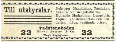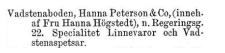 I Idun kan man hitta flera annonser från Vadstenaboden, och i början är det Hanna som står som ägare. Frågan är vem & Co. är? Dessa annonser kommer från Idun 3/2 1900 samt 4/1 1899.