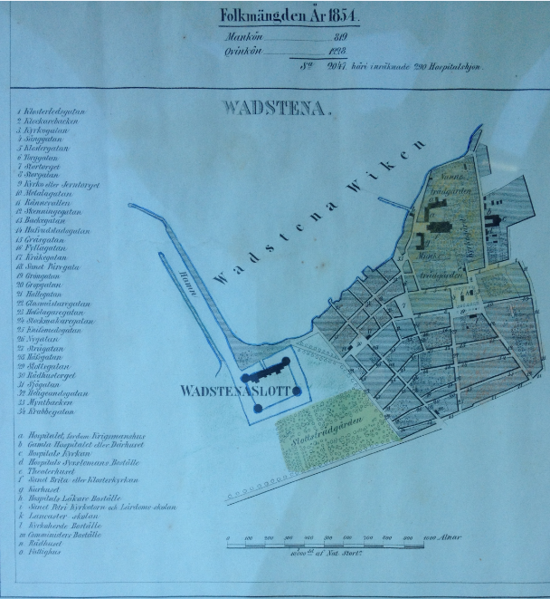 Vadstena var inte så stort på den tiden jämfört med idag. Av informationen ovanför kartbilden ser vi att det bodde 2047 personer i Vadstena 1854 varav 290 hospitalshjon.