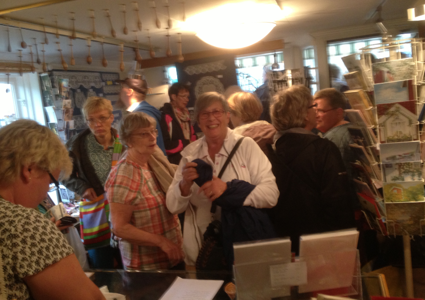 Bredvid Harriet under parasollet satt Kerstin från Vadstenas spetsgångare. (Hoppas jag fick namnet rätt) Spana in den läckra trollsländan på hatten!