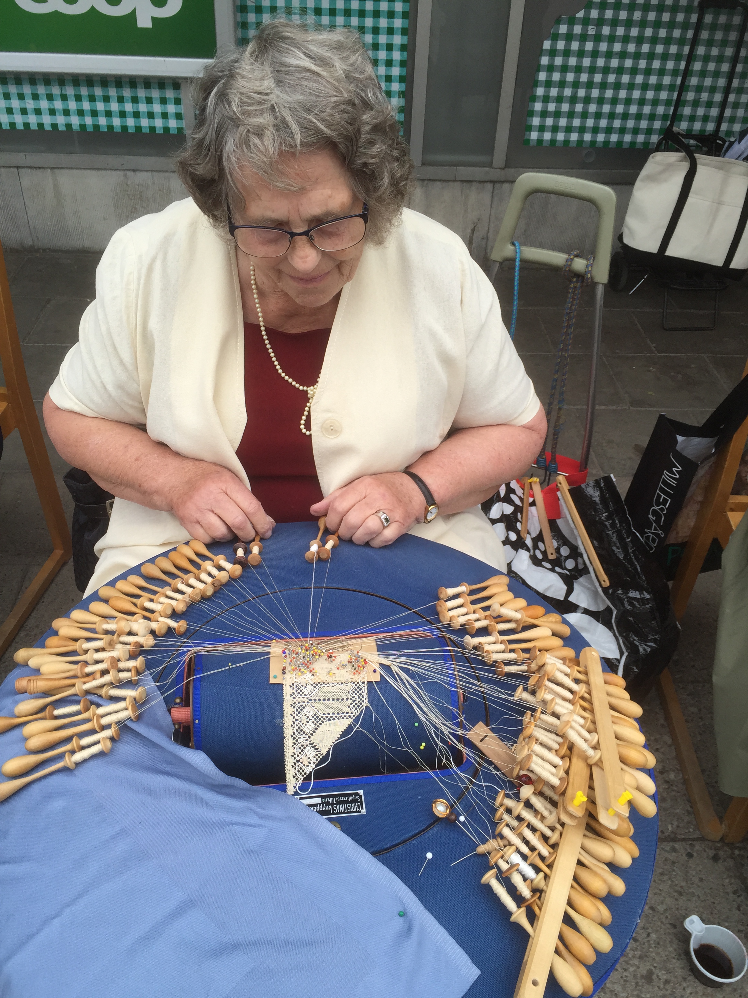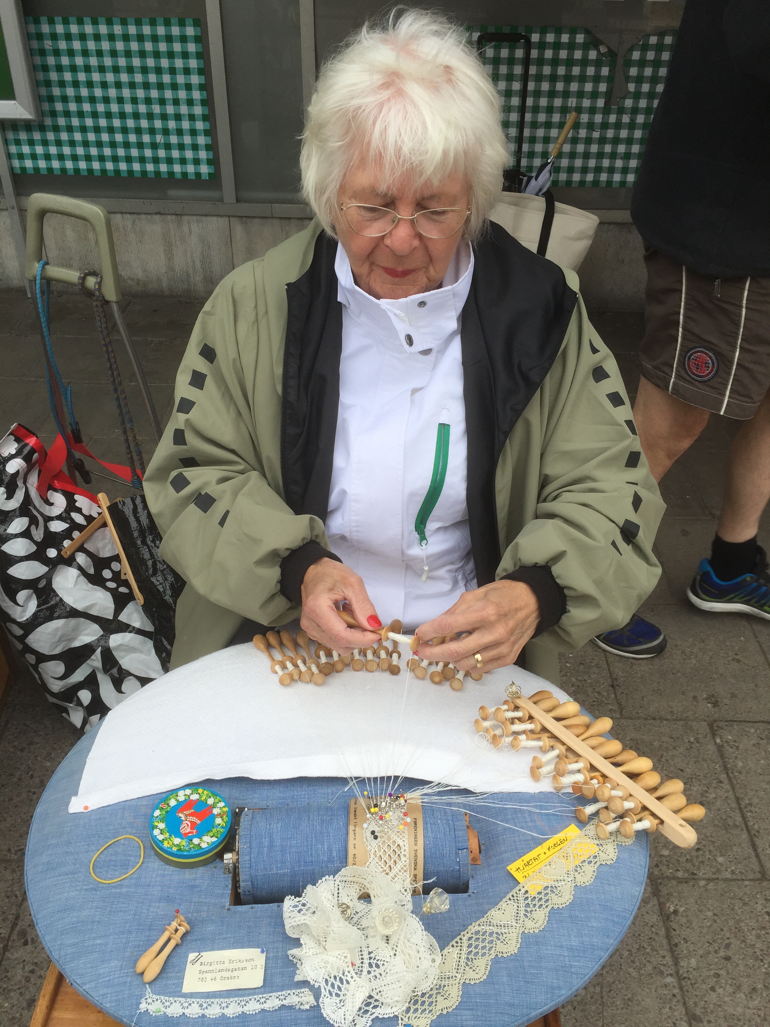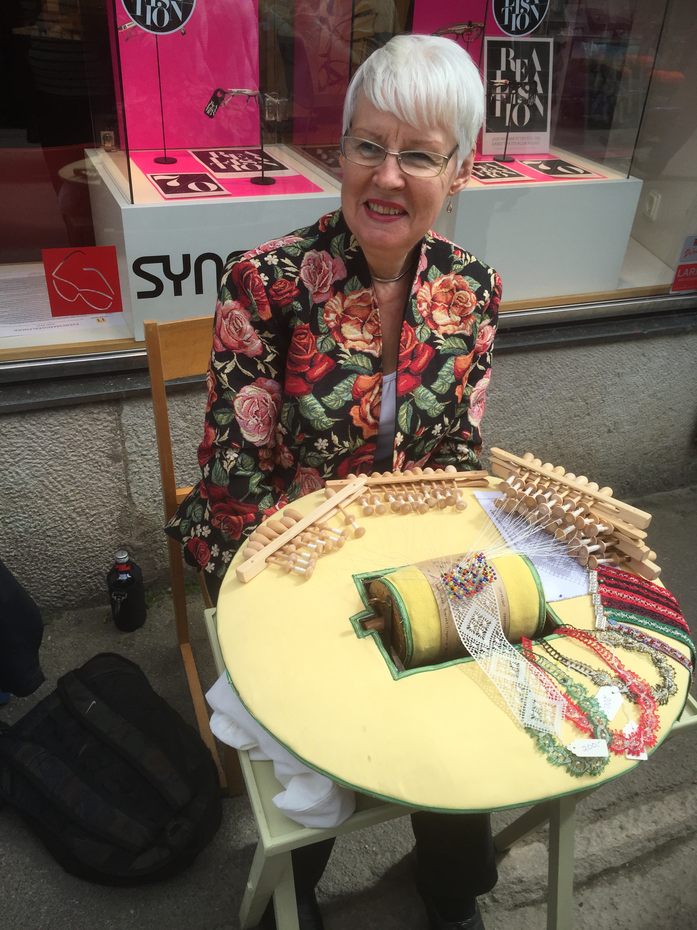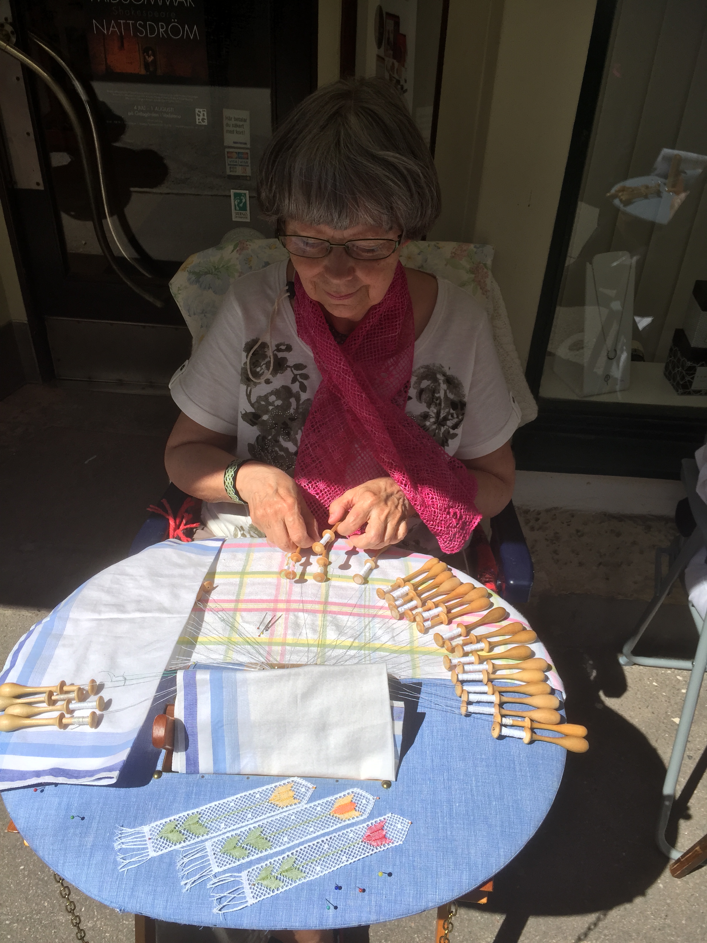 Vädret blev trots försommaren väldigt bra. Allt startade men ”lagom” mycket sol för sedan bli aningen mindre soligt – men inget regn och i alla fall runt 15 grader varmt. Men efter att sitta och knyppla från 14.00 till 17.00 kan ändå bli lite kyligt. Jag träffade på en strumplös knypplerska på väg hem klockan 17 och hon var allt lite frusen. Många kom dragande på sina dynor förbi affären efter förrättat värv. Har de skottkärror frågade mamma!