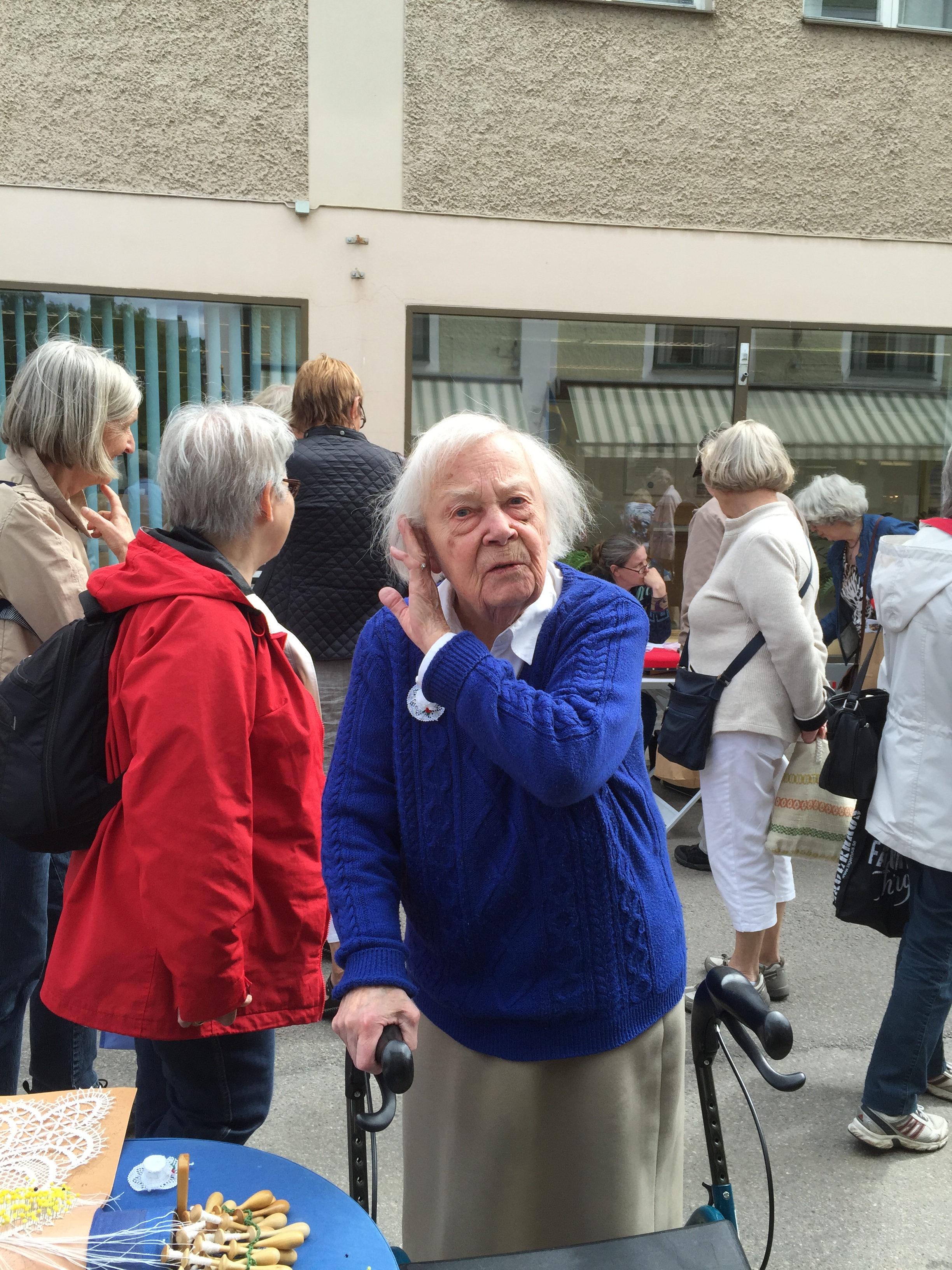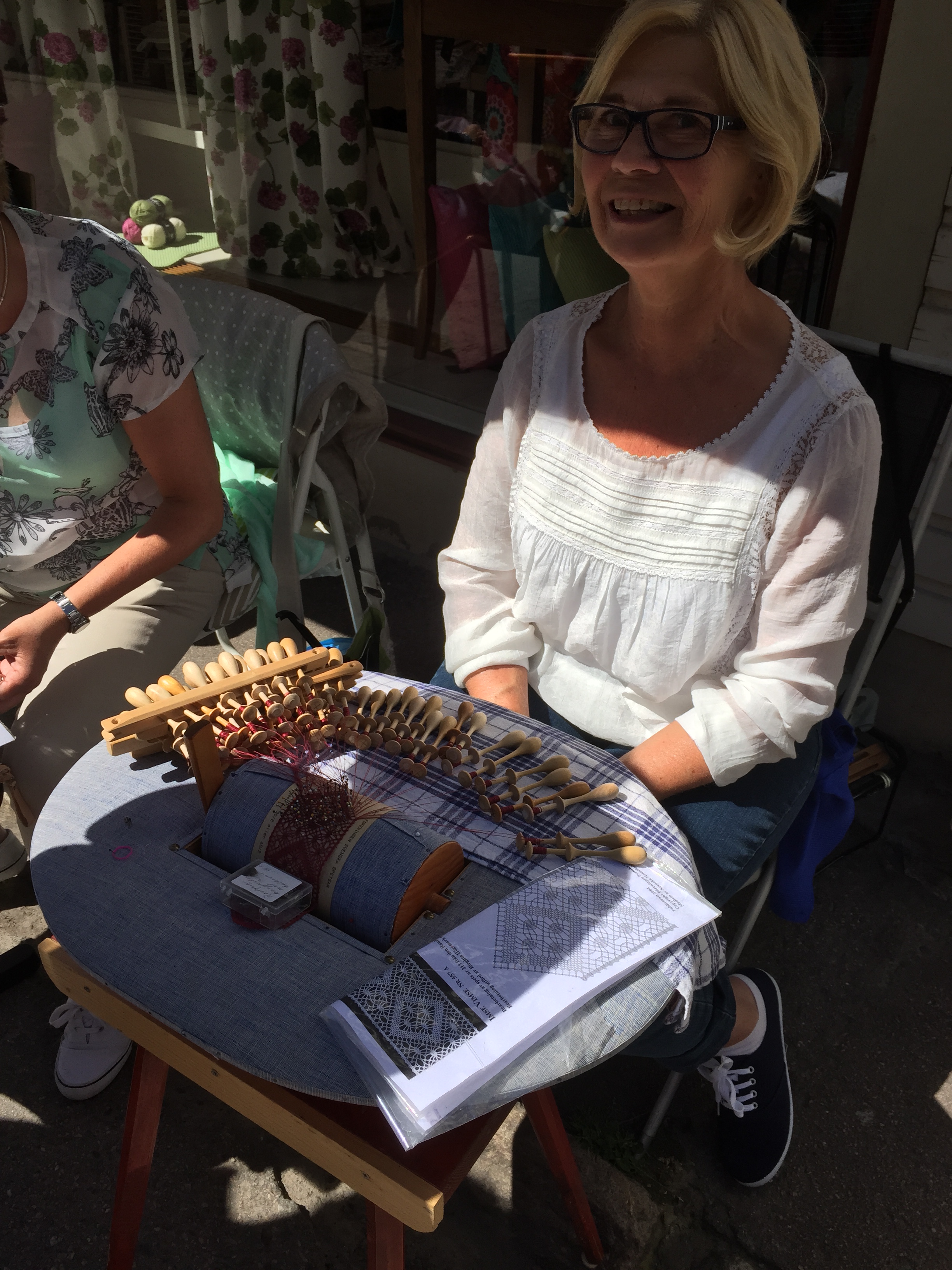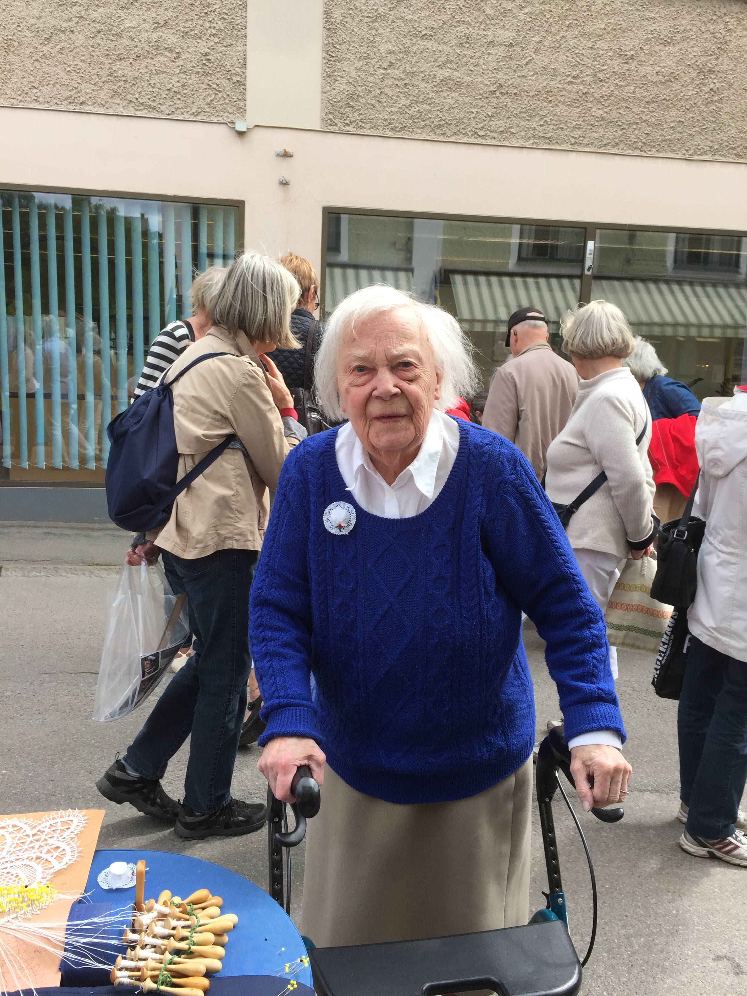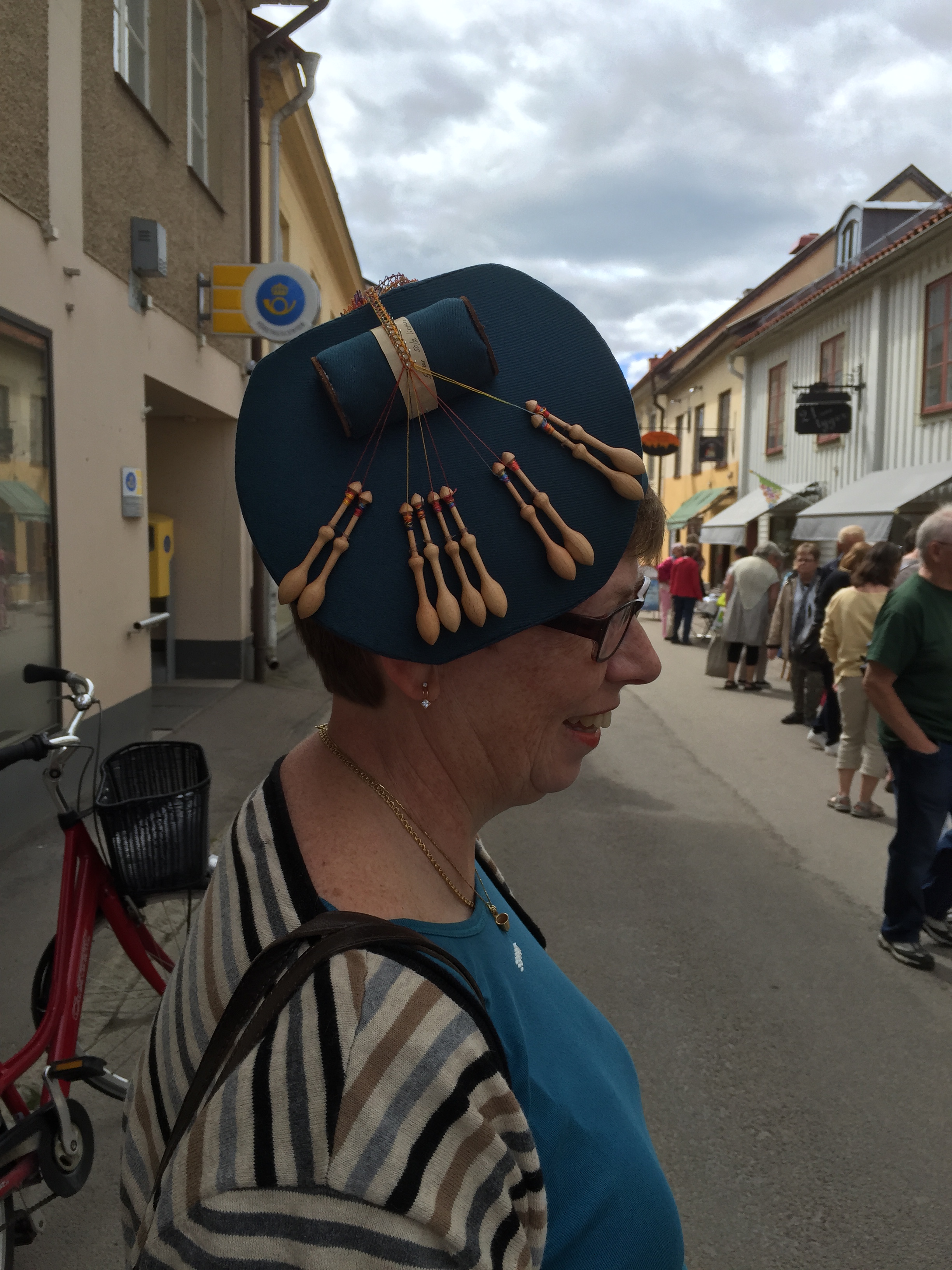 Vädret blev trots försommaren väldigt bra. Allt startade men ”lagom” mycket sol för sedan bli aningen mindre soligt – men inget regn och i alla fall runt 15 grader varmt. Men efter att sitta och knyppla från 14.00 till 17.00 kan ändå bli lite kyligt. Jag träffade på en strumplös knypplerska på väg hem klockan 17 och hon var allt lite frusen. Många kom dragande på sina dynor förbi affären efter förrättat värv. Har de skottkärror frågade mamma!