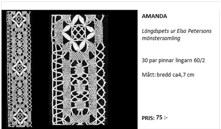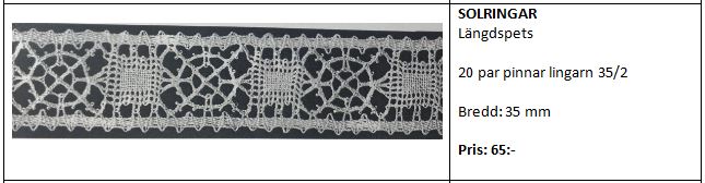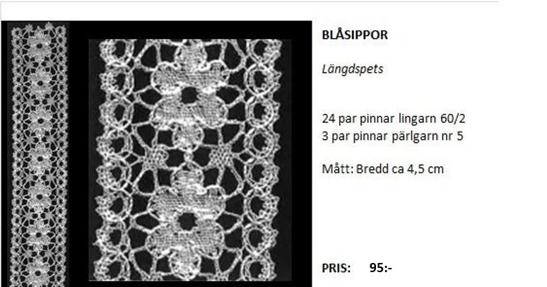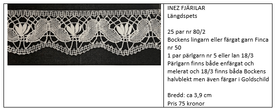 Karin LÄNGDSPETS 60 par pinnar nr 60/2, 4 par pinnar lan 18/5. Bredd 11 cm. Pris: 115 kronor Passar till Bård Karin – så att man kan knyppla en rektangulär Karin. Se Bårder.