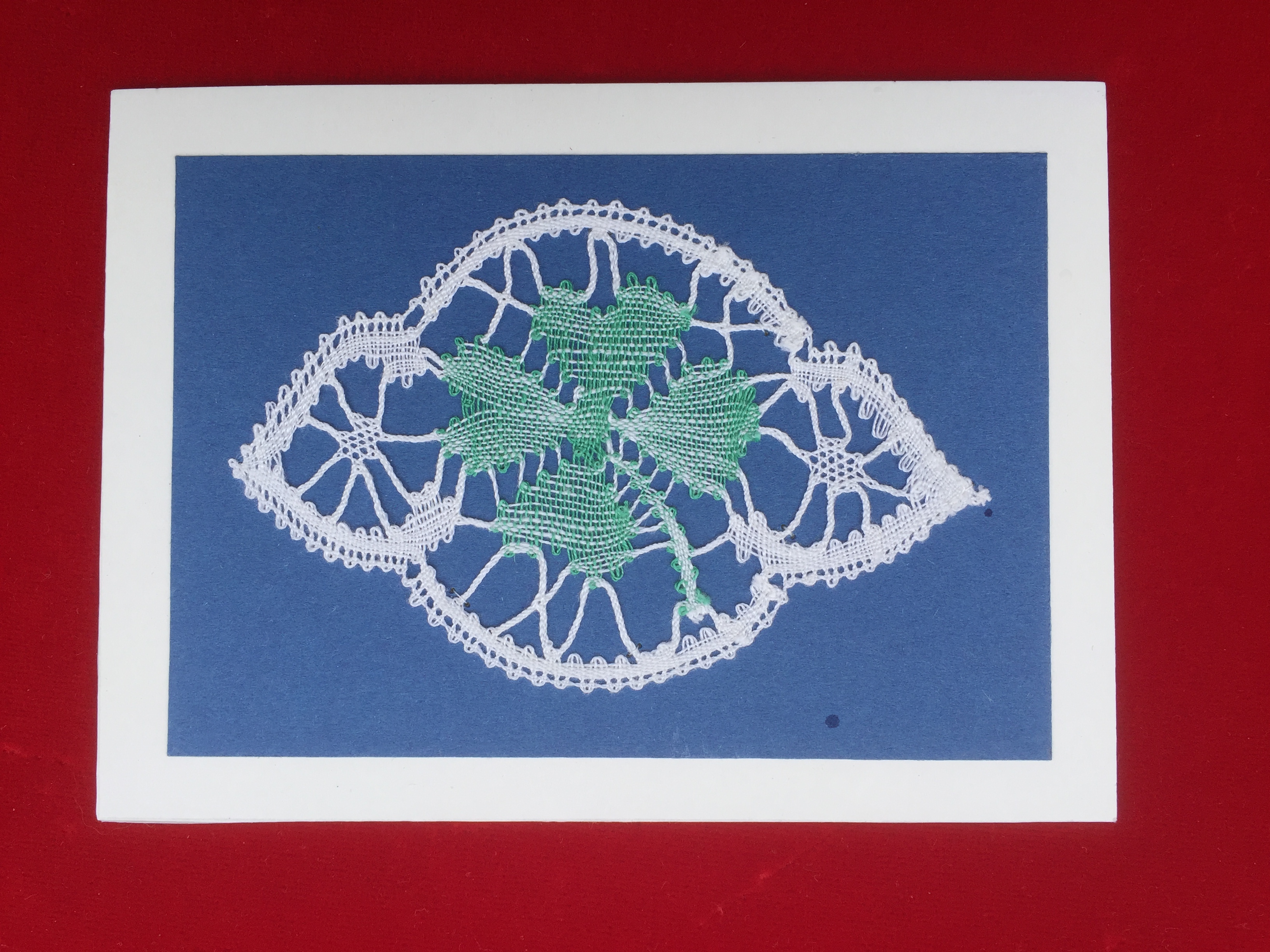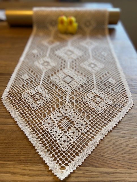 Birgittarosen, Löpare. 80 par pinnar 40/3, 3 par 18/5 och 18/3 sammanflätade. Mått ca 83 x 26 cm. PRIS: 195 kronor.