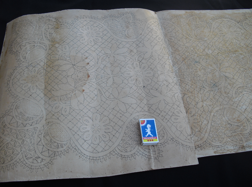 ”Vackert – men stort och komplicerat! På bilden syns ena halvan av mönstret till en stor helknypplad duk (det är en stor tändsticksask som används för att ge en uppfattning om storleken)”