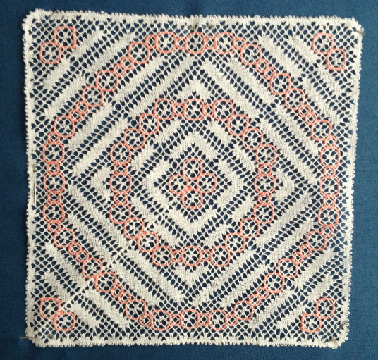 Här har rosa tråd använts som lan, och i den blå du ser i skyltfönstret är det tvärtom, blå tråd och vit lan.