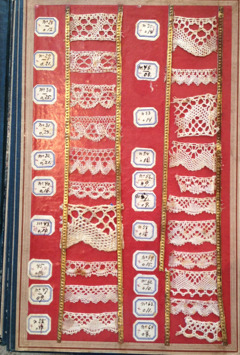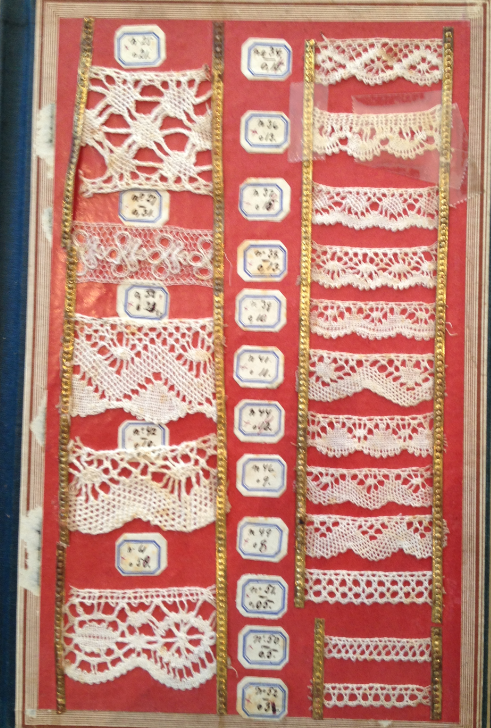 Denna bild är tagen på Nordiska muséet. Bilden är lite suddig, men vi kan ändå känna igen spetsen och vi ser att den kallas Sockeruddarna. Eftersom samma spets finns både med och utan spindel brukar man skilja dem genom att den ena kallas endast sockerudd, medan den andra kallas sockerudd med spindel. Om du går tillbaka till bild 3 och 4 från den röda provboken kan du se flera olika exempel på sockerudd, både med och utan spindel.