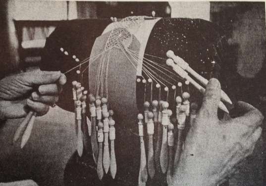 Den här bilden kommer också från International old Lacers (1974). I texten kan man läsa att kvinnan som knypplar har hittat en del mönster i svenska och franska böcker.