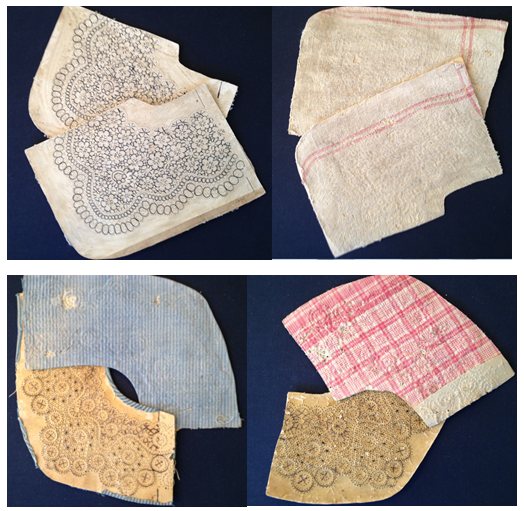 Ett mönster som använts mycket kan bli skört. Ett sätt att stärka mönstret och förlänga livslängden var att limma mönstret. Ett annat var att förstärka mönstret med tyg på baksidan. Här ovan ser vi exempel på några mönster som förstärkts ordentligt med handdukar och förkläden! Men så här långt behövde det naturligtvis inte gå innan man beställde ett nytt mönster. Det kostade ju pengar att få fram ett nytt mönster, så det gällde att vårda mönstret, samtidigt fick det inte gå för långt då ett slitet mönster inverkar på spetsens utseende.