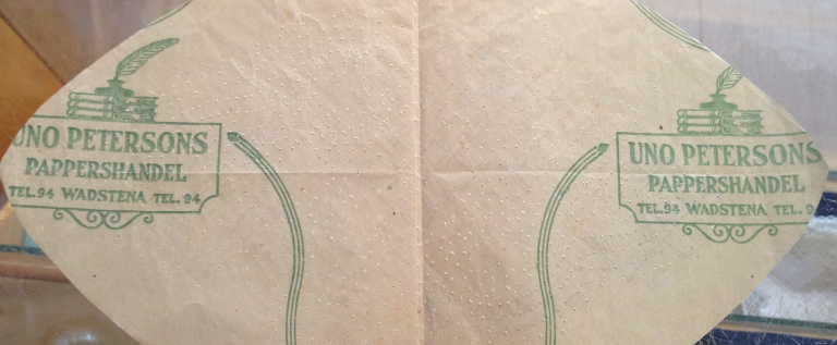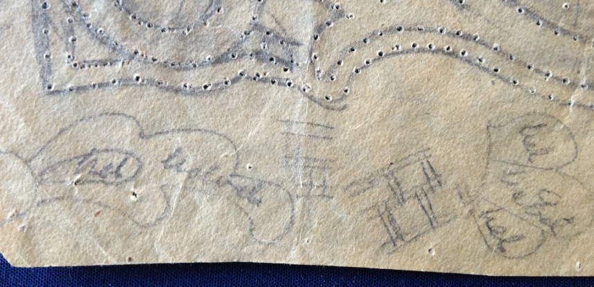 Här har vi ett utkast gjort på en tårtkartong från Astrid Tryggs Hembageri! Av de följande bilderna framgår det att man ibland tog vad man hade för att göra ett utkast, en lagom stor pappersbit var vad som behövdes.