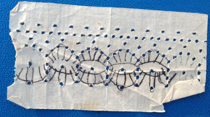 De två tidigare utkasten visar två vanliga längdspetsar. Detta utkast är gjort av Inez Pettersson. Det är ett eget komponerat mönster ritat på smörpapper. I det här mönstret kan vi se hur Inez först har ritat ”bilden” och sedan placerar hål för att det ska bli knypplingsbart. Inez strategi när hon gjorde egna mönster var att provknyppla själv så långt att hon såg att man kom fram på mönstret.