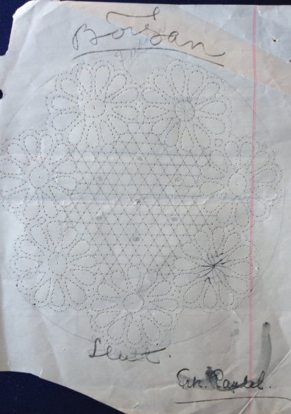 Nästa utkast kommer från fröken Randel. Det enda man ser här är var man ska börja och var man ska sluta. Det vi kan se är att det var svårt att få till ett mönster med rätt proportioner. En duk knypplat efter detta utkast lär inte bli helt rund. Samtidigt får man acceptera att det är en del av hantverket.