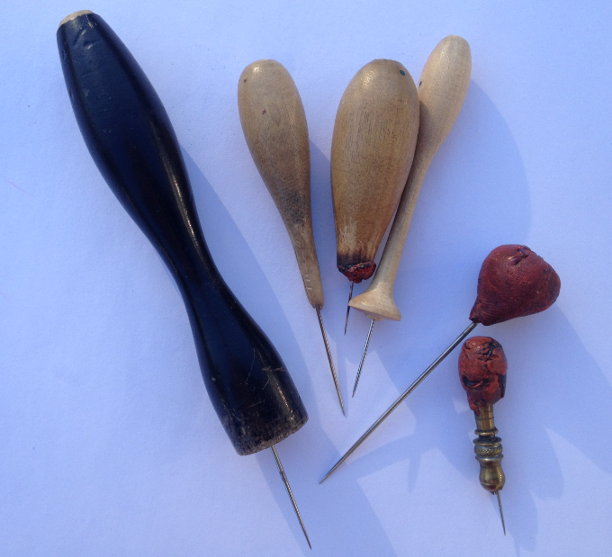 Här ser vi exempel på mönsterstickornas uppfinningsrikedom. Några sticknålar är tillverkade av knyppelpinnar och i de två till höger har man använt lack för att skapa något att hålla i.