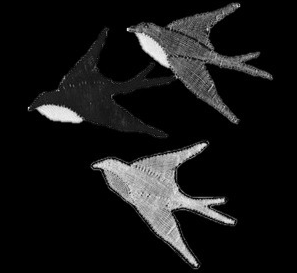 Flygande fågel av Inez Petterson (finns under Nyheter). I Bakgrunden syns stor fjäril med mandlar, Näckrosen och Vadstenahjärtat inramade.